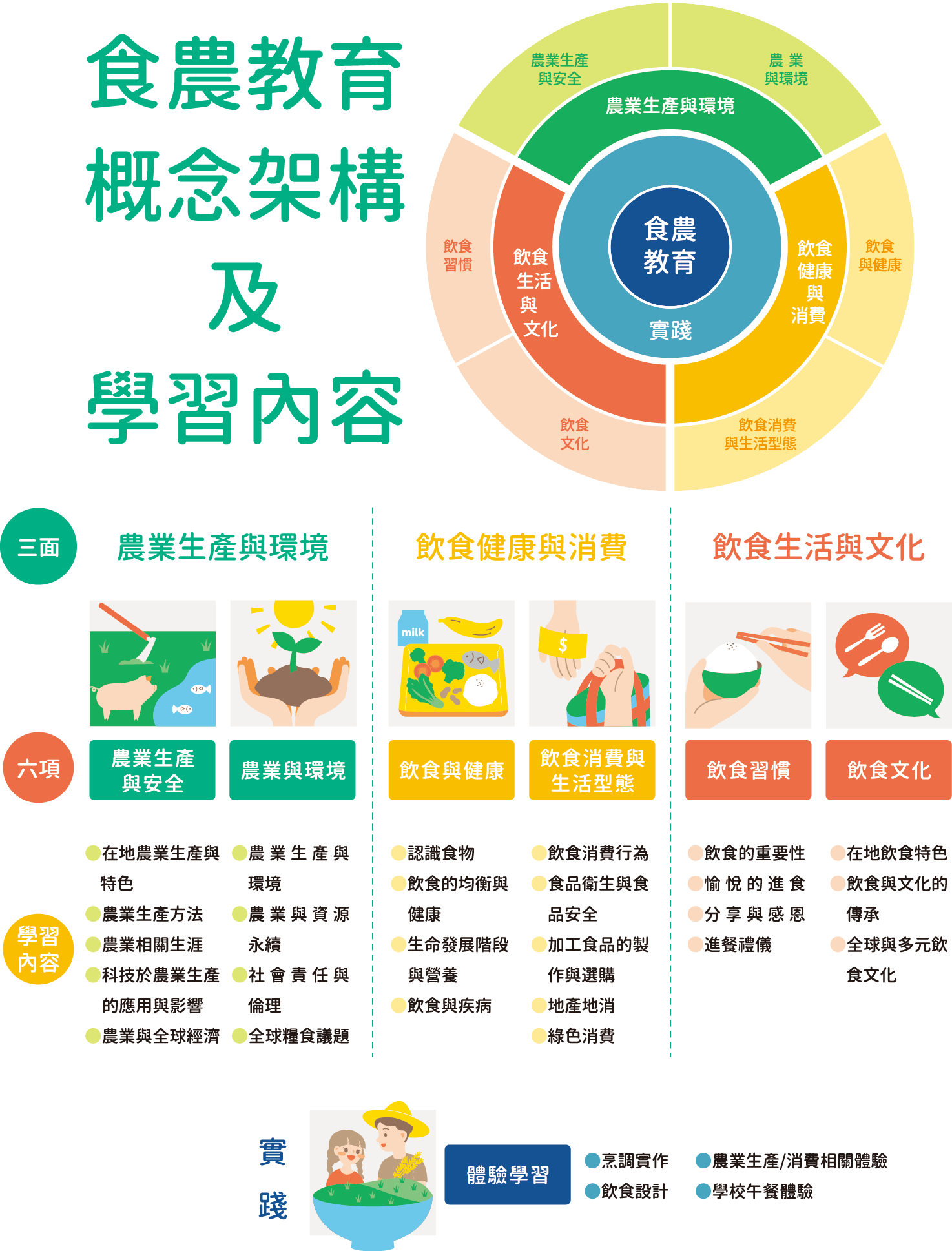 依據農業部食農教育推廣計畫—食農教育教學資源平臺揭露資料,為協助國民瞭解我國食農教育的內涵,農業部委託國立臺灣師範大學人類發展與家庭學系林如萍教授研發「食農教育ABC模式」,以培養「食農素養」(Food and Agricultural Literacy)為目標,提出食農教育的內涵—三面六項「農業生產與環境-與環境共好」、「飲食健康與消費-自發實行健康飲食生活」、「飲食生活與文化-人際互動與傳承」。推動應提升目標對象知能之廣度及深度,發展具完整性,聚焦主題作物發展完整之三面六項學習內容、系統性內容(如:針對不同發展階段對象,提出對應的食農教育主題及體驗學習活動)。