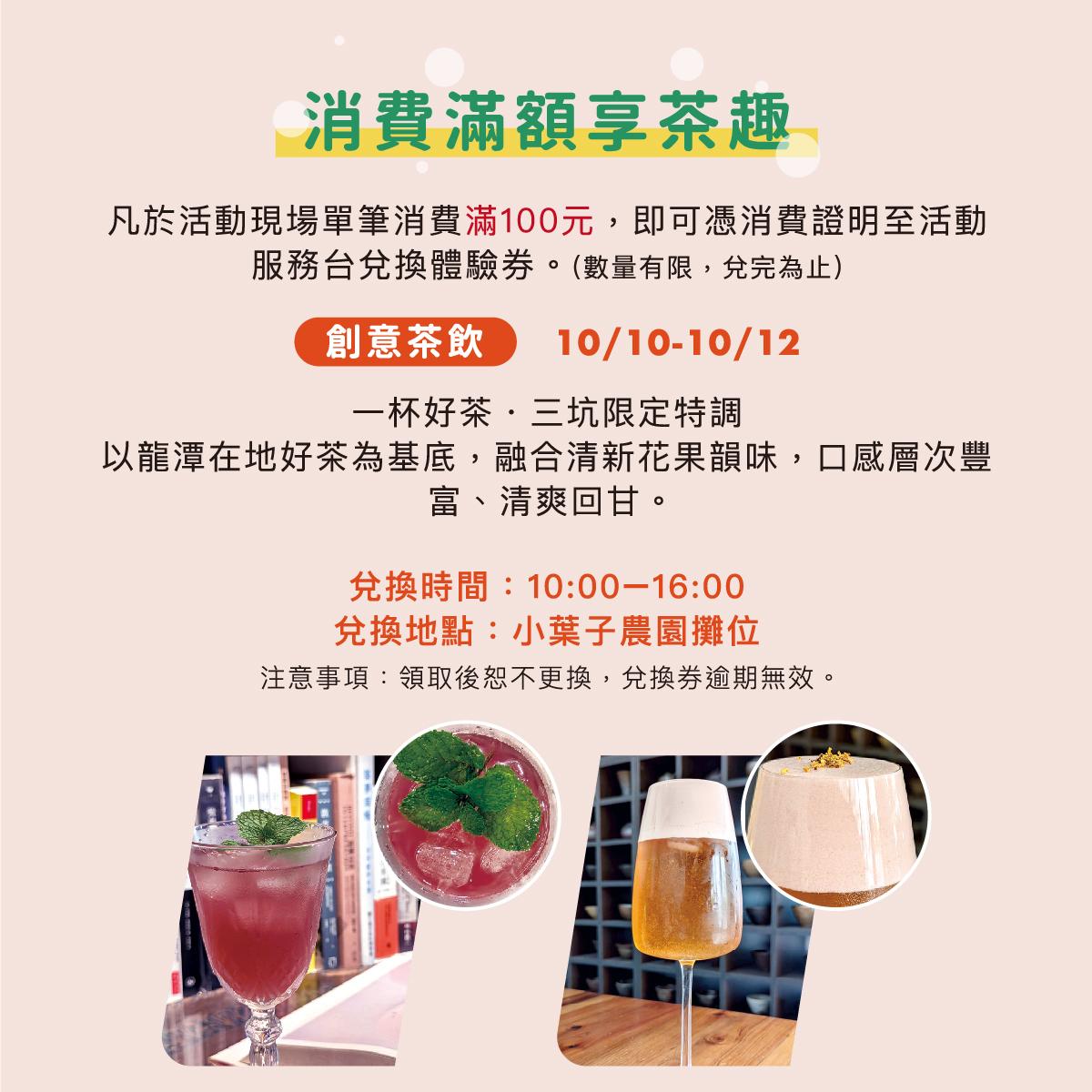 ⧫ 創意茶飲|10/10–10/12限定供應,以龍潭在地好茶搭配清新花果,清爽回甘!