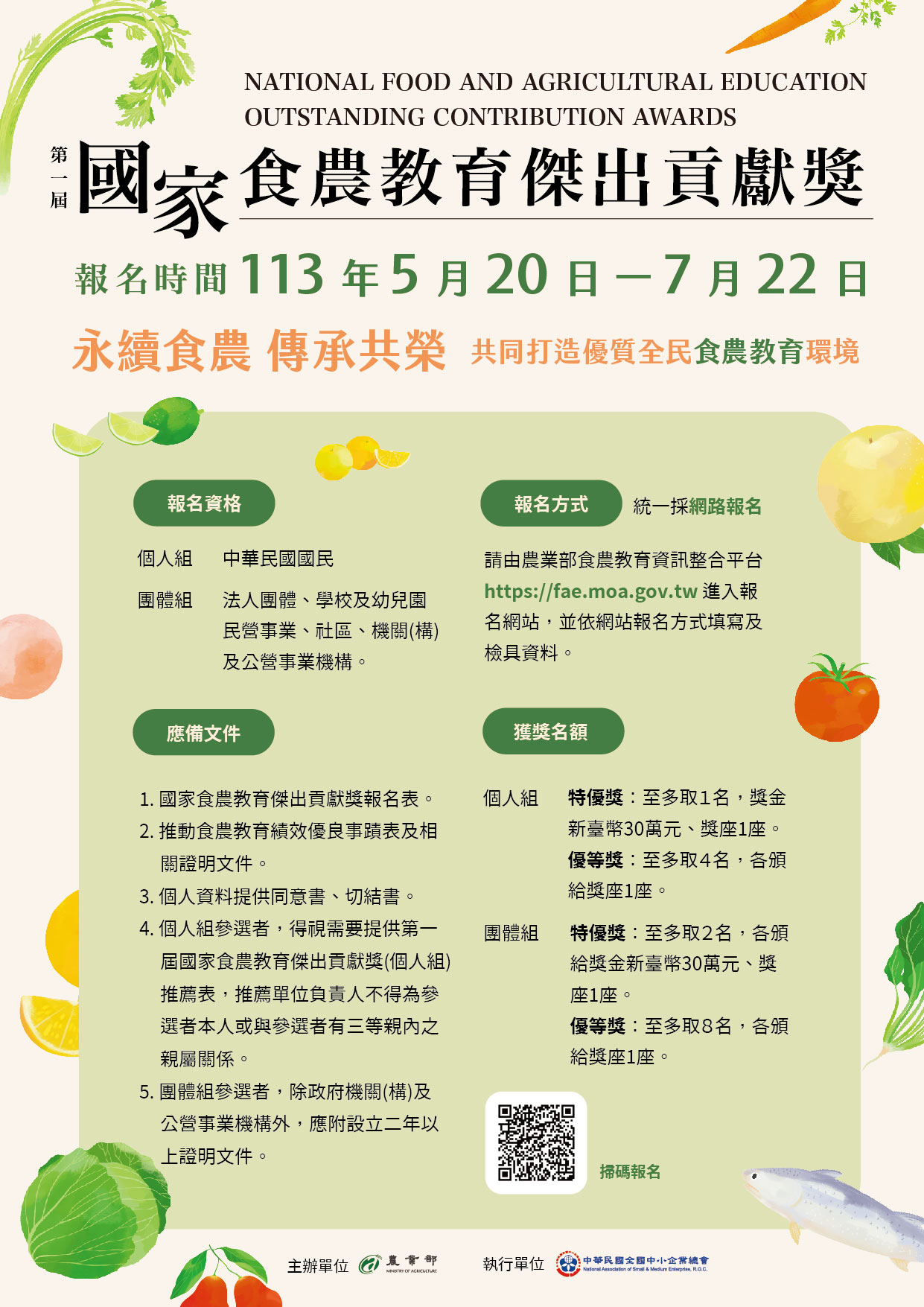 1.個人組:實際從事食農教育之規劃、宣傳推廣及輔導陪伴等相關實務,績效卓著之自然人。