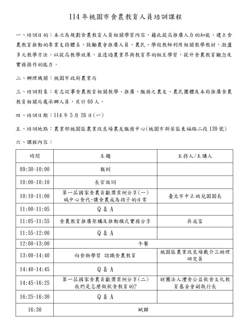 三、培訓對象:有志從事食農教育相關教學、推廣、服務之農友、農民團體及本府推廣食農教育相關局處承辦人員,共計60人。