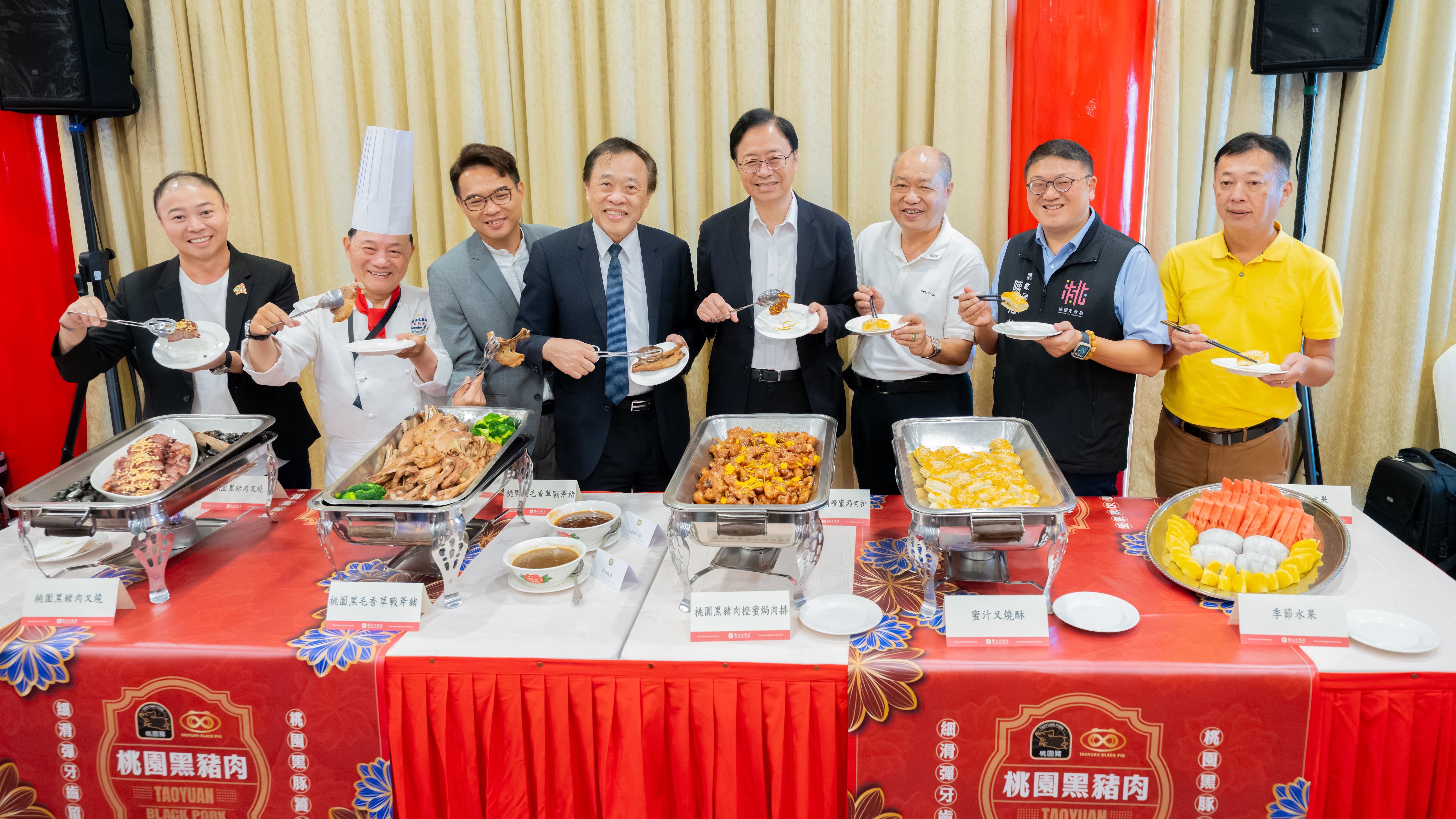 桃園市長張善政今(15)日上午前往臺北圓山飯店,出席「桃園黑豬創意餐點行銷活動記者會」。張市長表示,桃園黑豬肉鮮嫩多汁、脂肪分布均勻,富含不飽和脂肪酸,所烹調料理不僅美味,更具營養價值;適逢拉拉山水蜜桃盛產期,活動現場也特別推出融合黑豬肉與水蜜桃風味的創意香腸,口感獨特、風味絕佳,盼桃園優質農產與特色美食能香傳全臺。