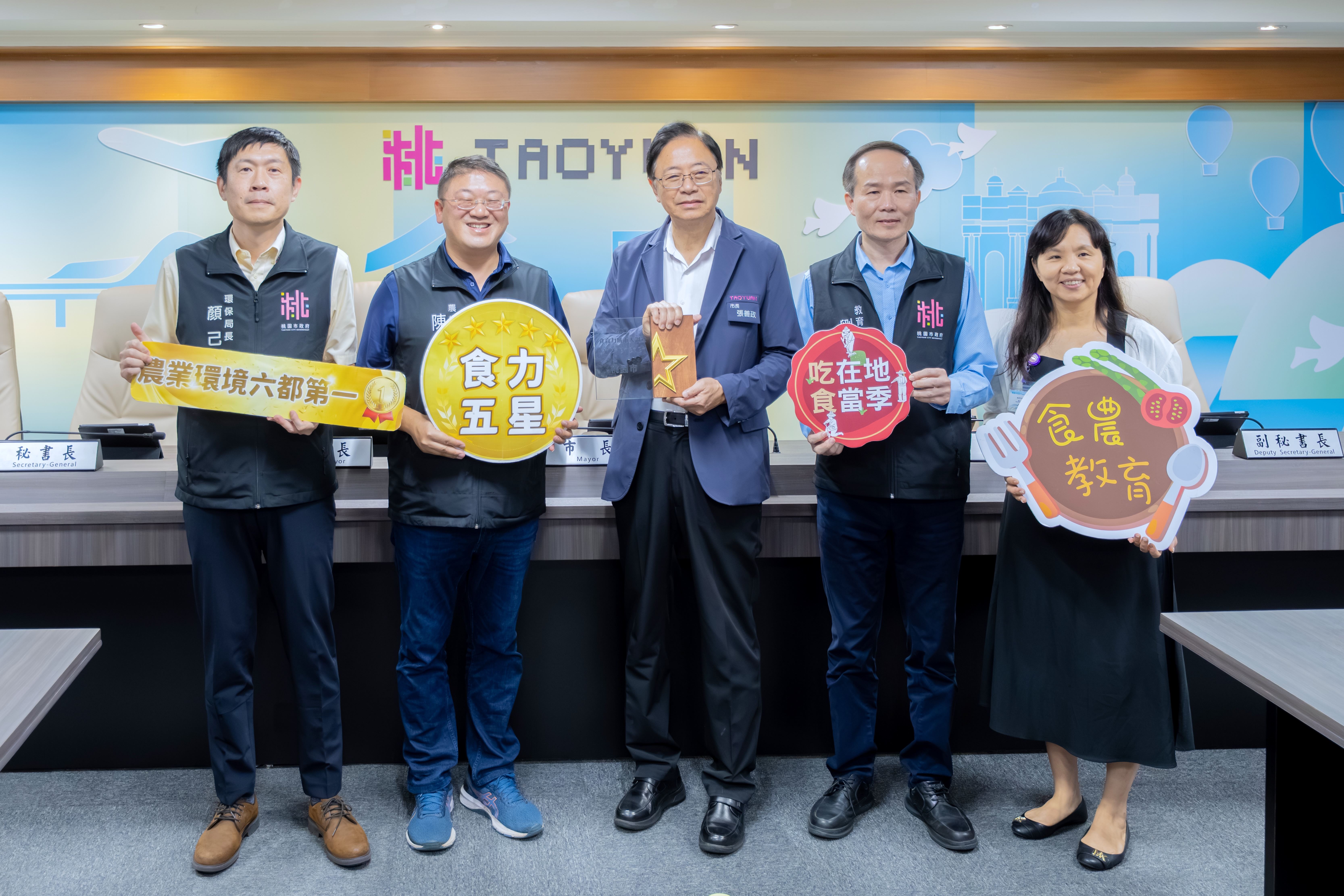 桃園市長張善政今(27)日上午主持市政會議,接受農業局呈獻榮獲「2025食育力城市大調查五星城市」。張市長表示,市府重視食安與食農教育,感謝各局處齊心努力,讓桃園的食安、食農政策與成果獲得肯定。未來將持續跨局處合作,讓食農教育更貼近市民生活,持續將桃園打造成全國食育力的典範城市。
