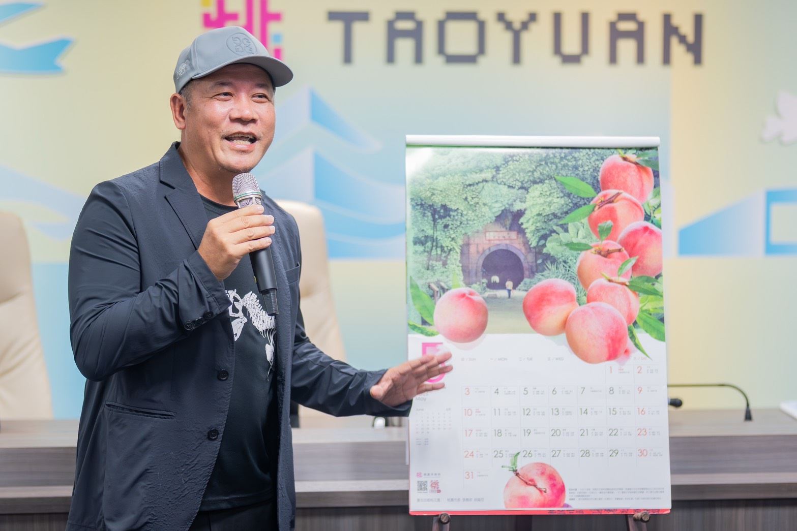 桃園市長張善政今(12)日下午於市政會議前,率領局處首長及2026桃園農產月曆設計總監蕭青陽共同宣傳「2026桃園農產月曆」。張市長表示,去(113)年推出的「蛇馬龍舞」月曆廣受歡迎,今(114)年農產月曆主題是「馬力食足」,再度邀請蕭青陽老師操刀,以藝術結合農業為核心,透過全新視覺設計展現桃園農業之美。