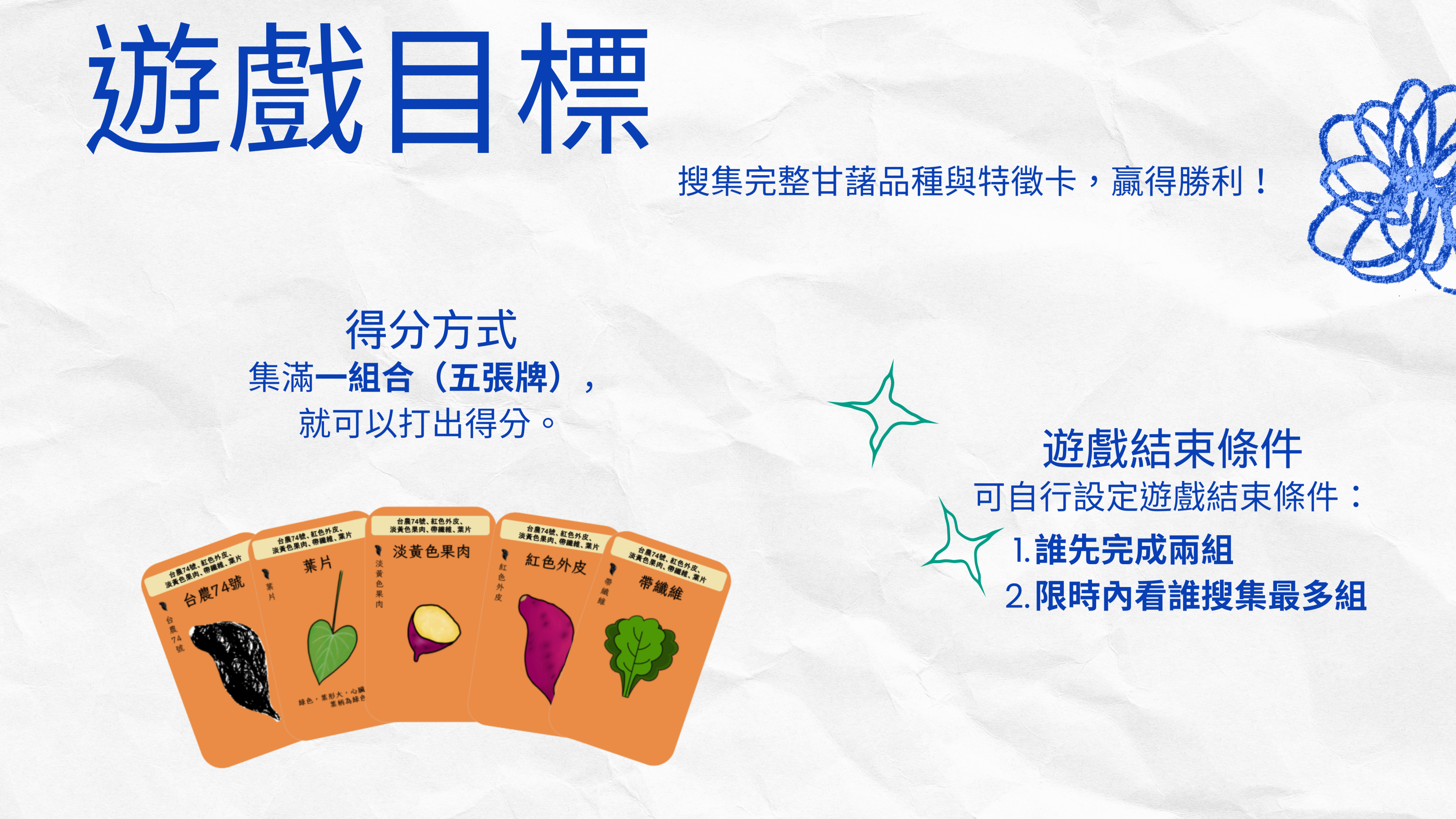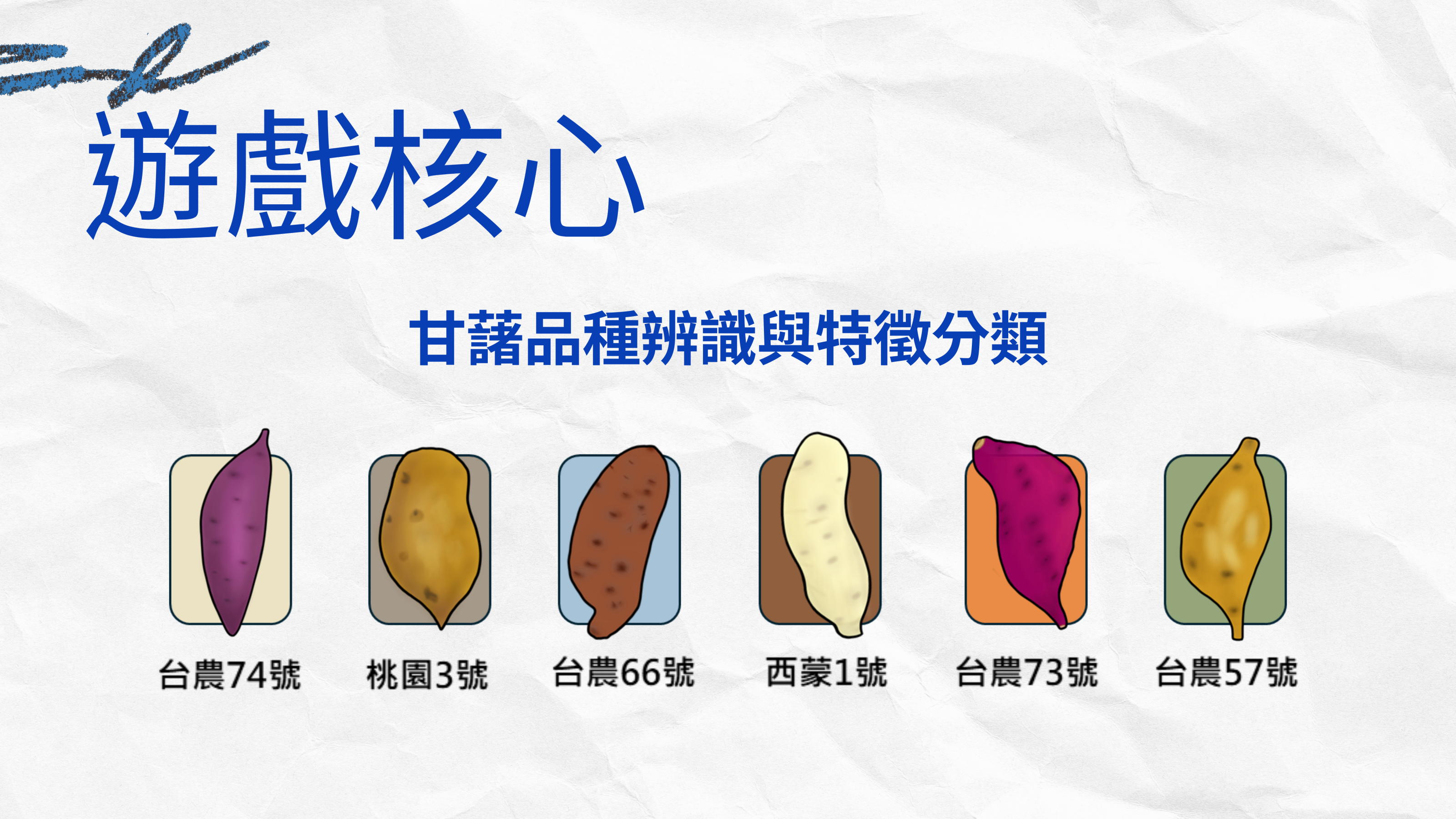 桃園場表示,該教具以「甘藷品種辨識」與「特徵分類」為主題的全新卡牌遊戲,內容涵蓋六種甘藷品種,依據外皮顏色、藷肉顏色、葉片形狀與口感等指標進行分類設計。玩家在回合中,透過詢問、記憶、推理及索牌,逐步蒐集並完成正確的品種特徵組合,以達成得分條件。為增強遊戲策略性與參與動機,卡牌也設計具多元操作效果的功能牌,包含偷看、交換、阻擋與指定等行為,加入了資訊隱藏和決策選擇的設計,讓玩家在不知道其他人手牌的情況下,必須靠觀察與推理來判斷對手的策略,並選擇最有利的行動來取得優勢。功能牌設計除豐富遊戲互動性與變化性,亦有助於學習者訓練應變思考與分類統整能力,進而強化其對甘藷品種差異的認識與記憶統整。