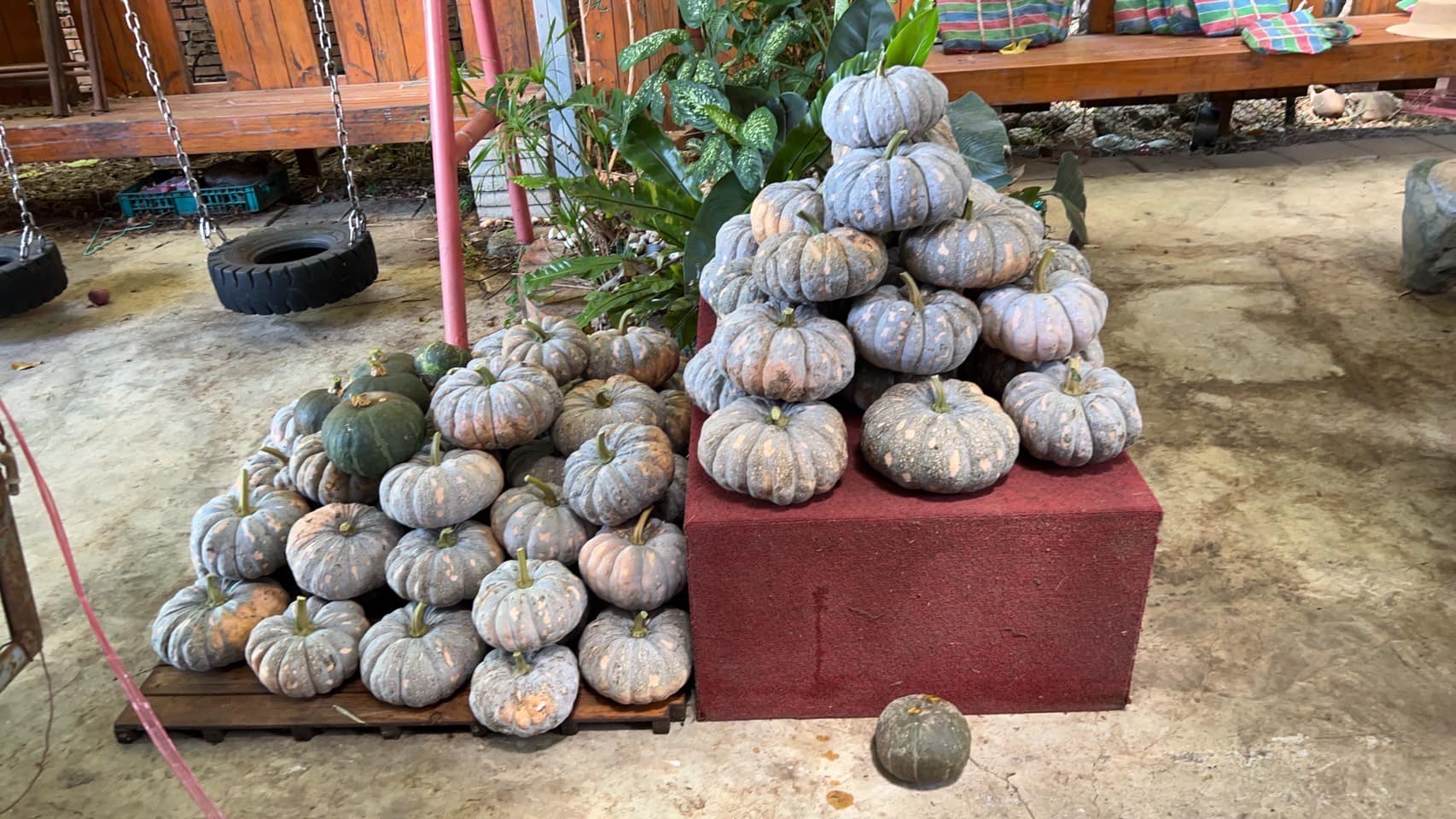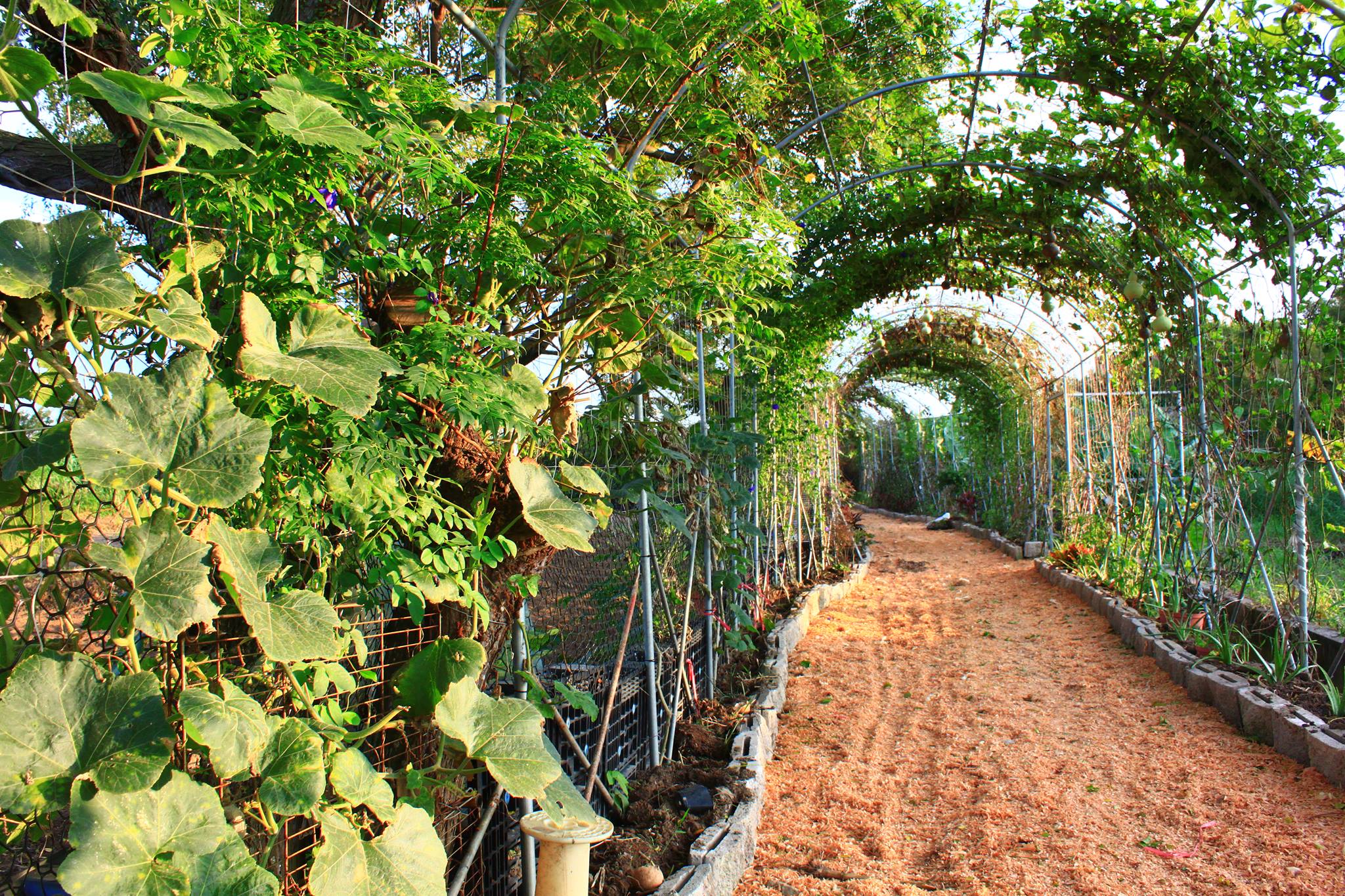 走入農場後,能看到農場運用會攀爬植物胡瓜、絲瓜、蒜香藤、苦瓜、翼豆疊出綠意瓜棚走廊,增加景觀綠化效果,收成也作為小農體驗活動使用。