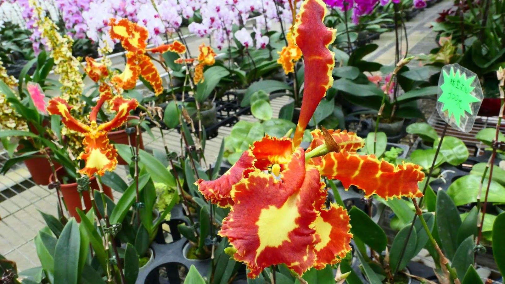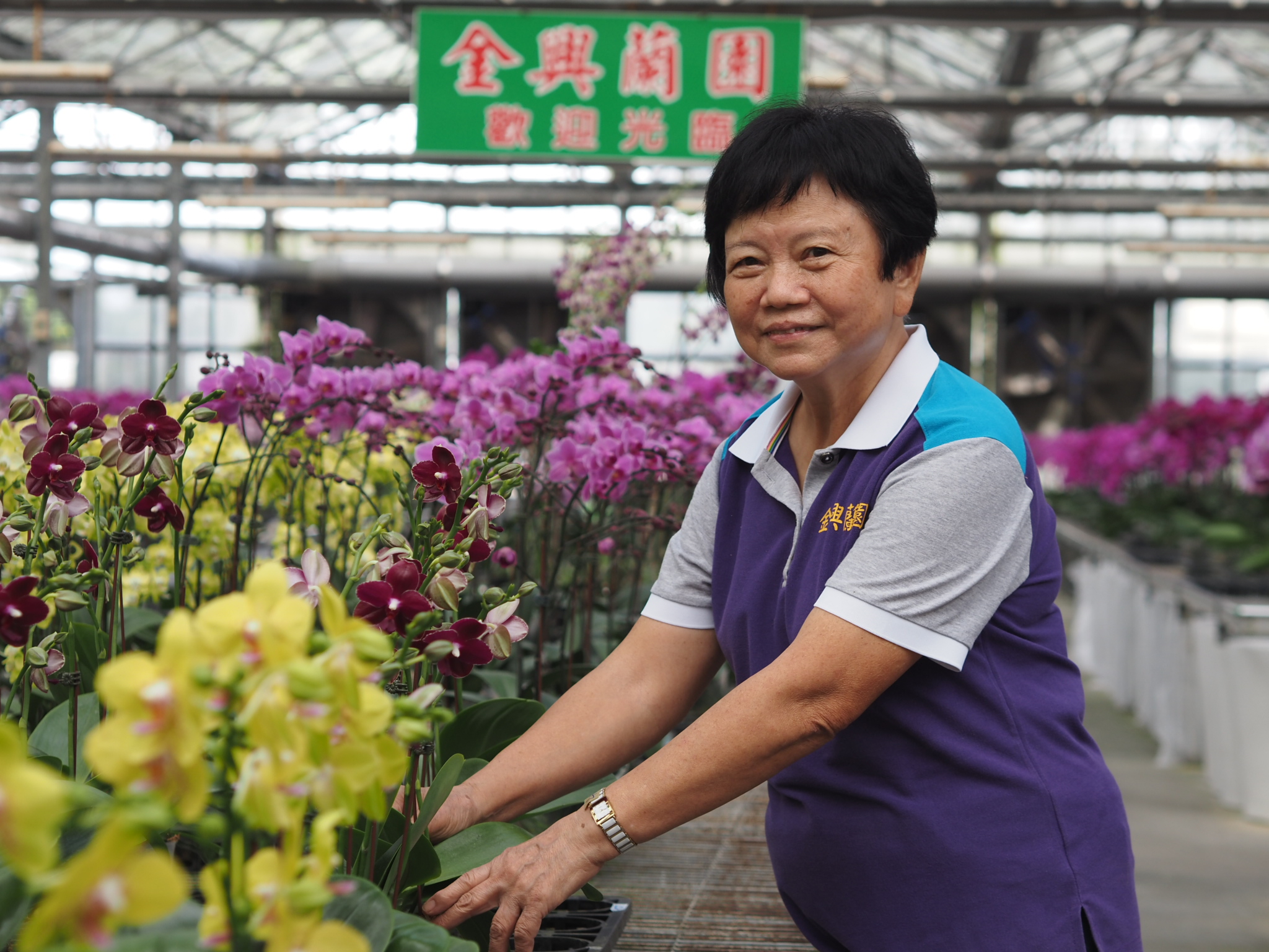 距離桃園大溪老街不遠的月眉有一座金興蘭園,數萬株各式蘭花整齊的擺放在600坪的大型溫室裡,走進去彷彿遊逛一座美麗大花園。